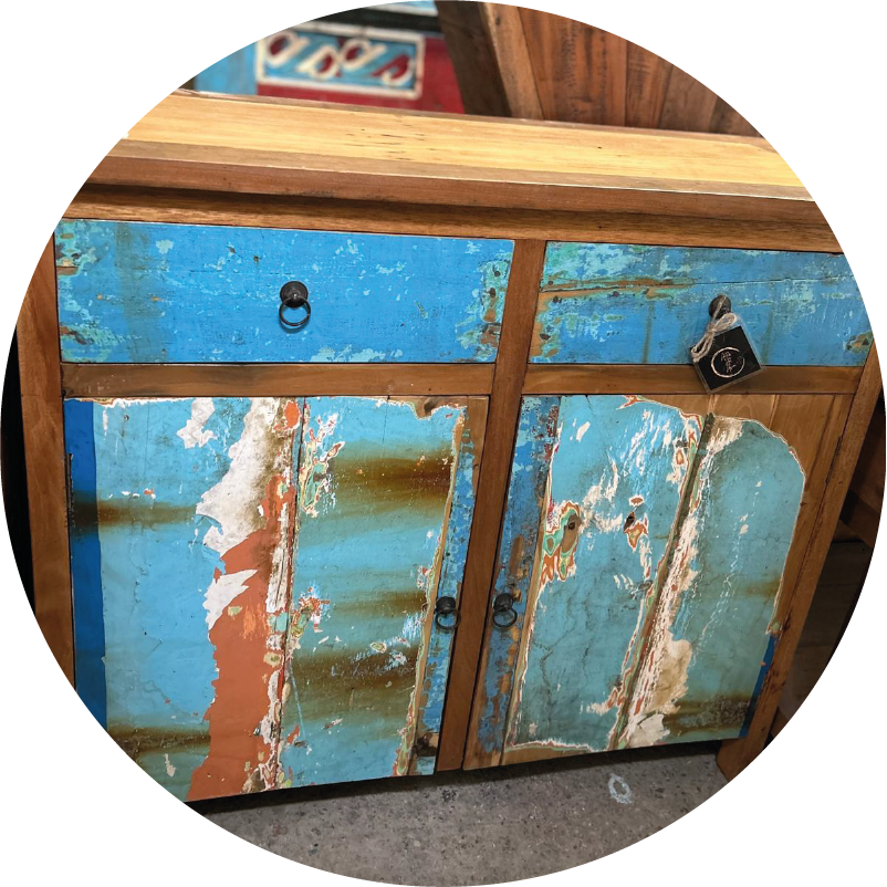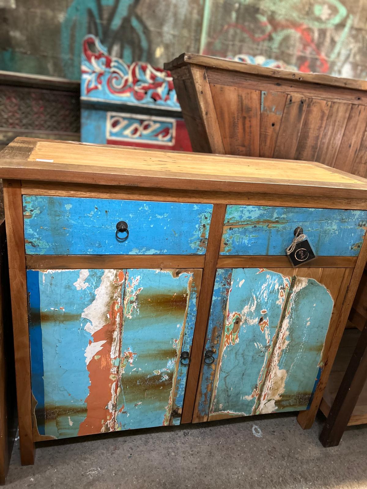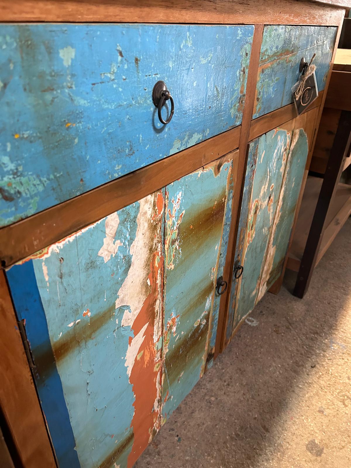 Bahut bleu et marron en bois de bateau