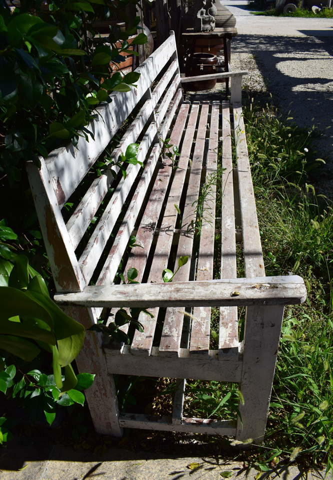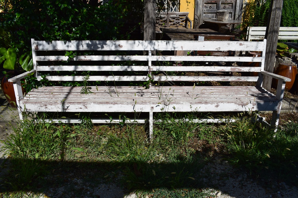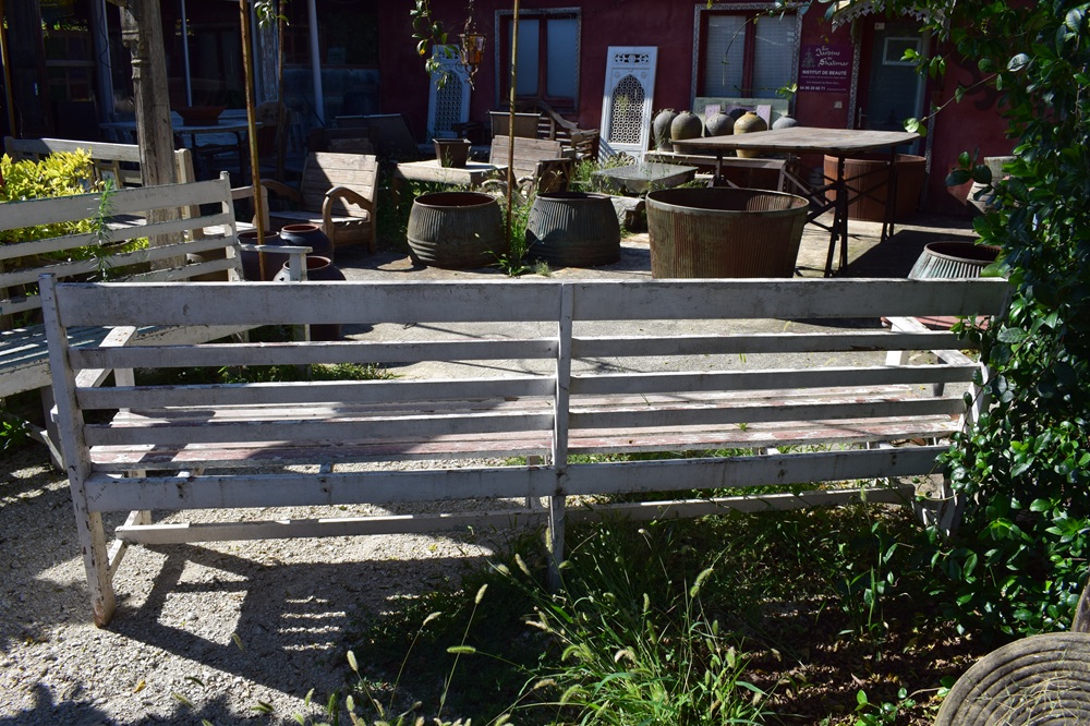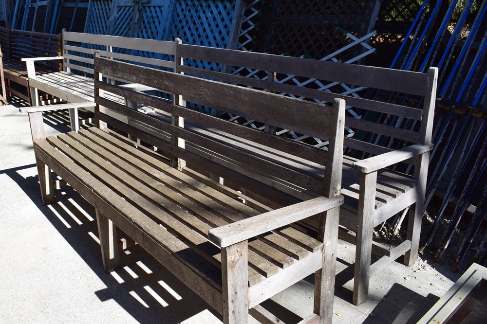 Bancs en teck, anciens, patine blanche ou bois naturel, Java, Indonésie.