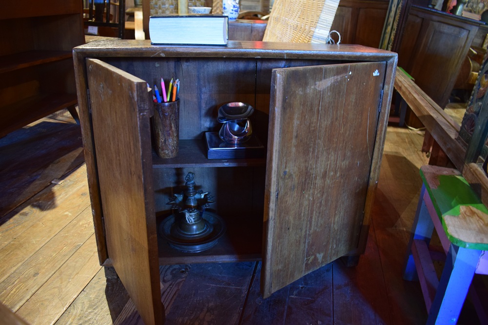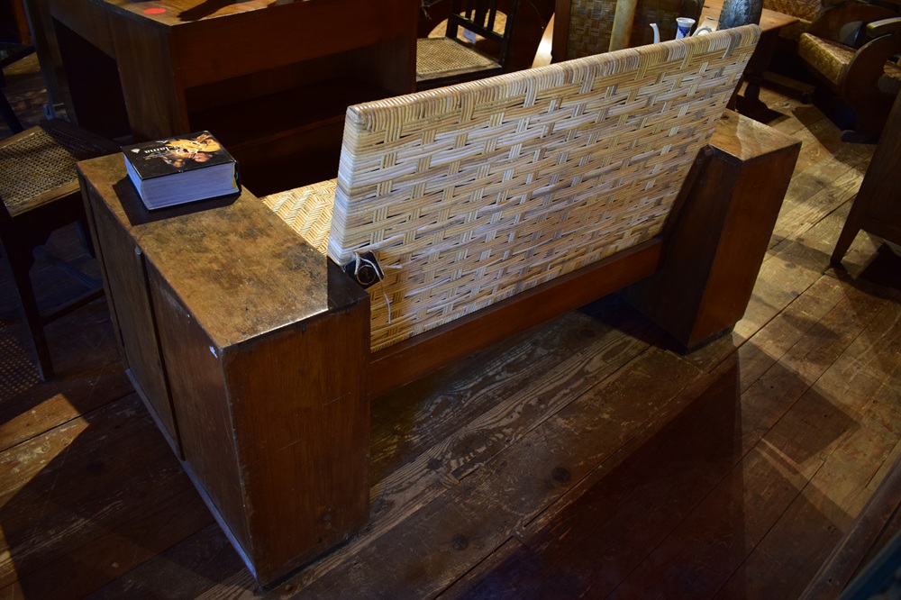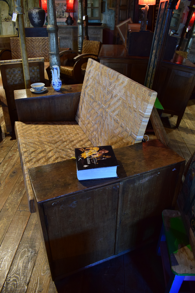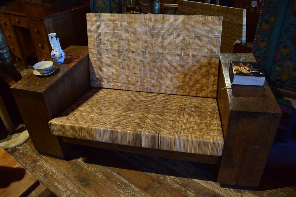Banquette en teck & rotin, Art-Déco, ancienne, avec deux rangements dans les accoudoirs. Provenance Java Centre.