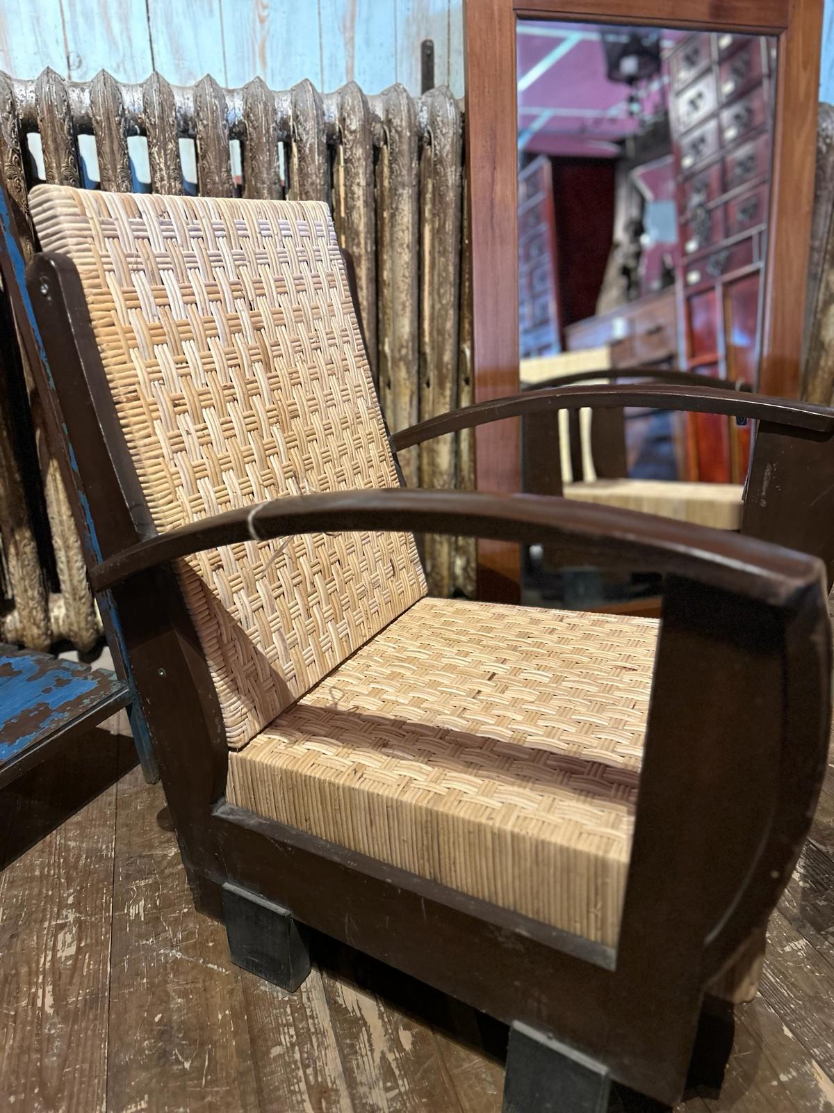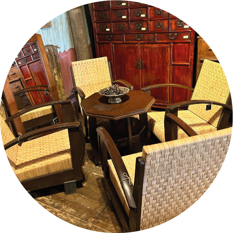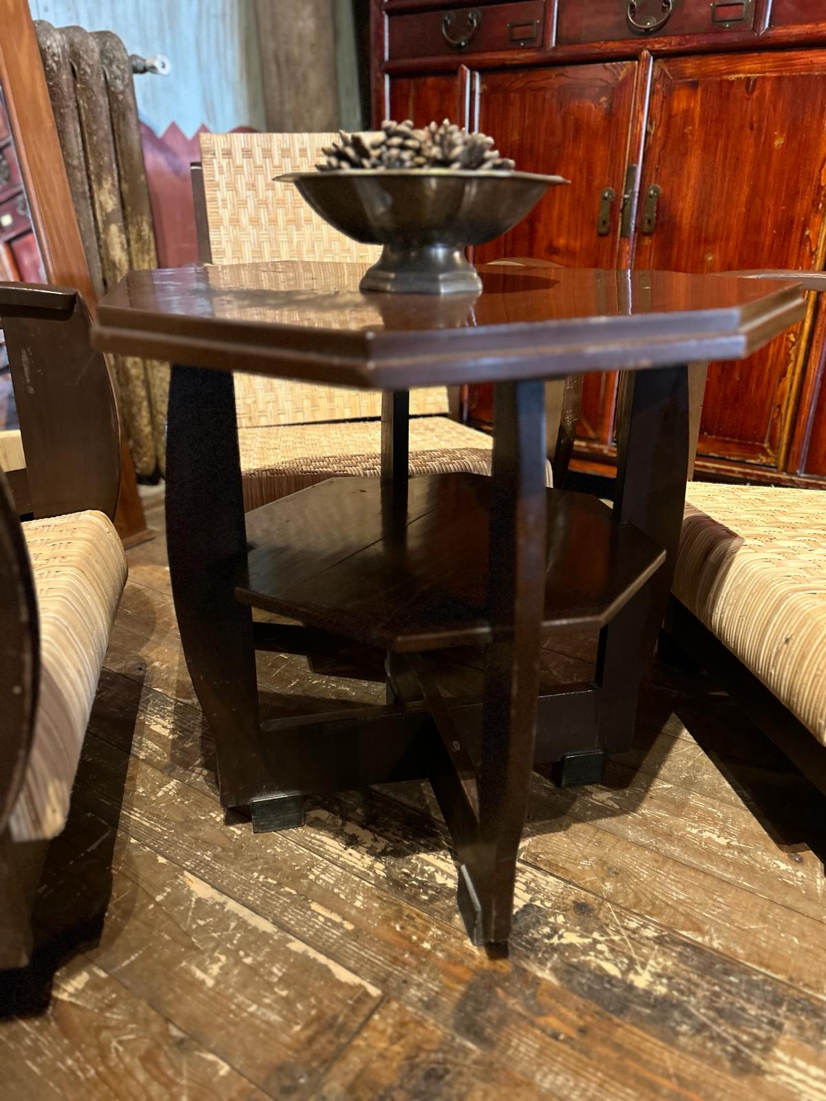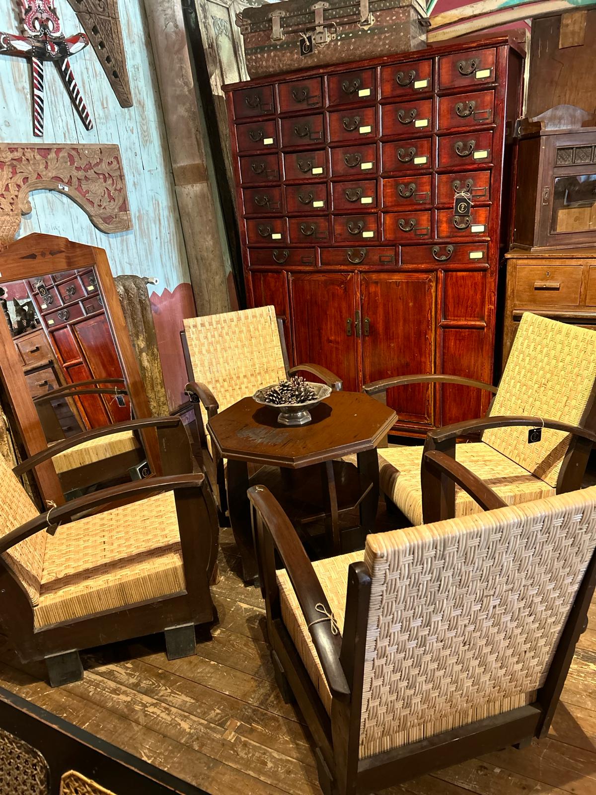 Ensemble pour intérieur (5 pièces) : table hexagonale en teck indonésienne + quatre fauteuils marron