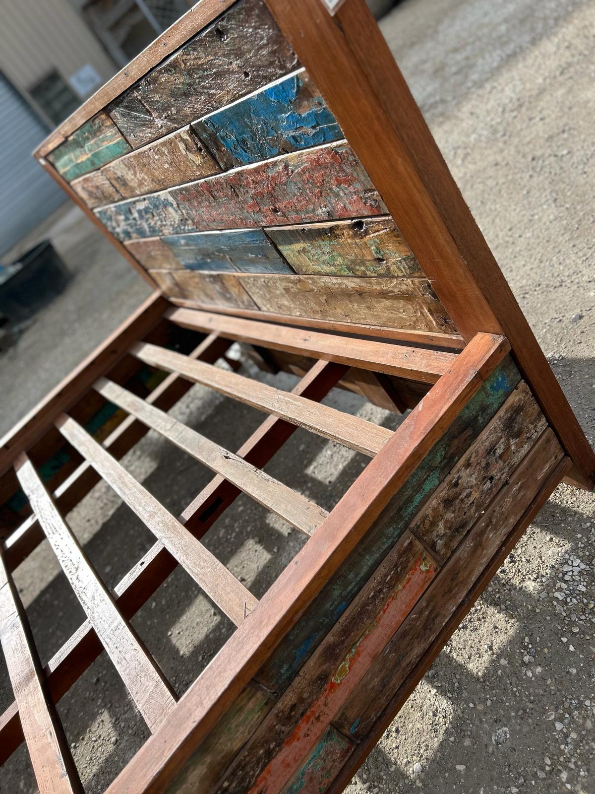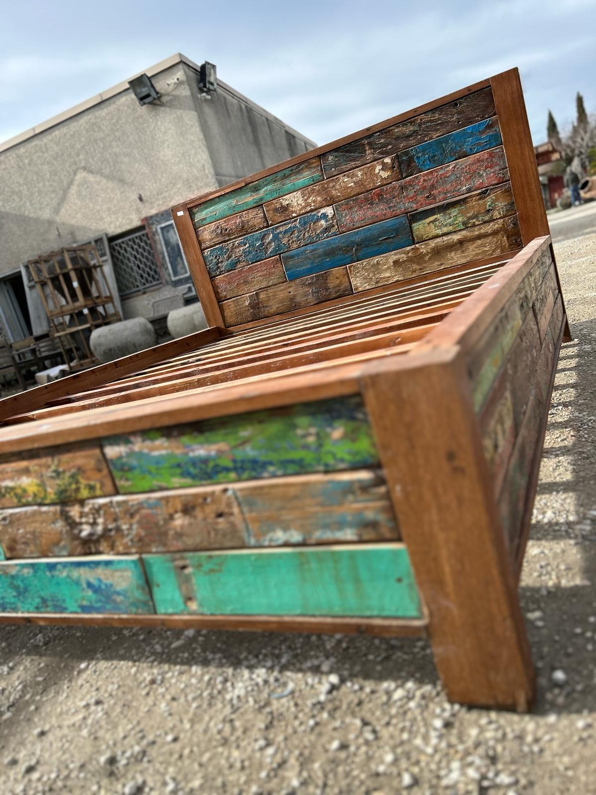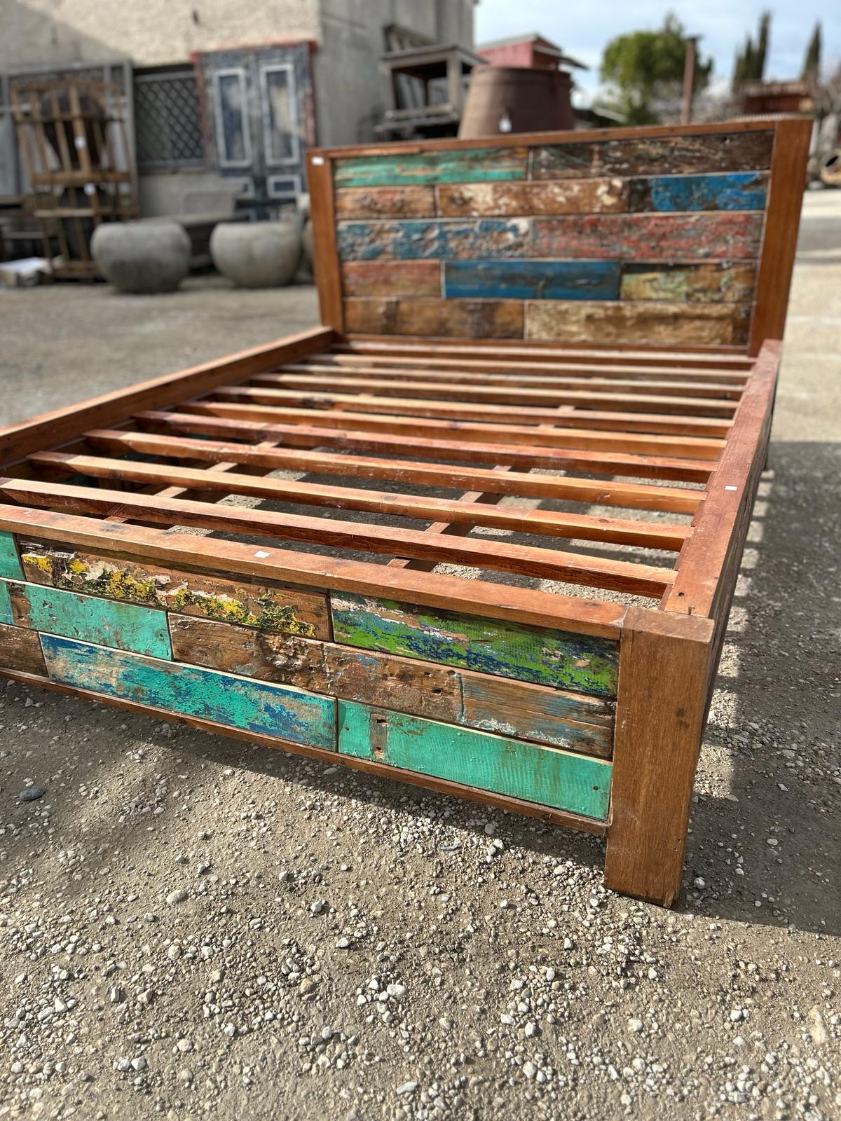 Lit en bois de bateau multicolore. Lit qui comprend une tête de lit et un encadrement pour un matelas de 160x200cm.