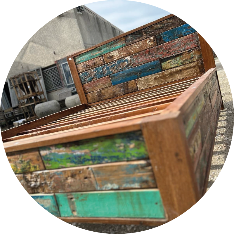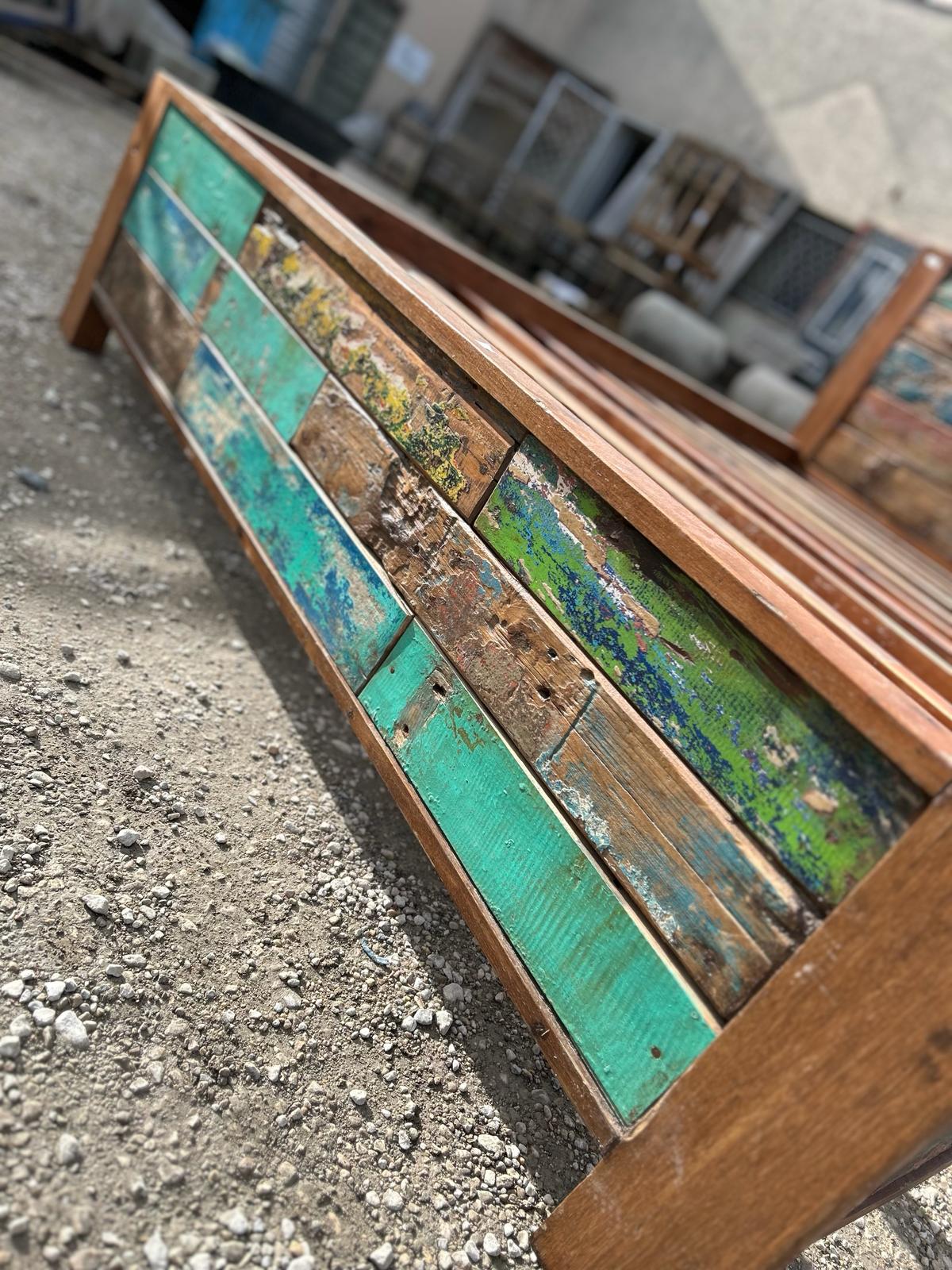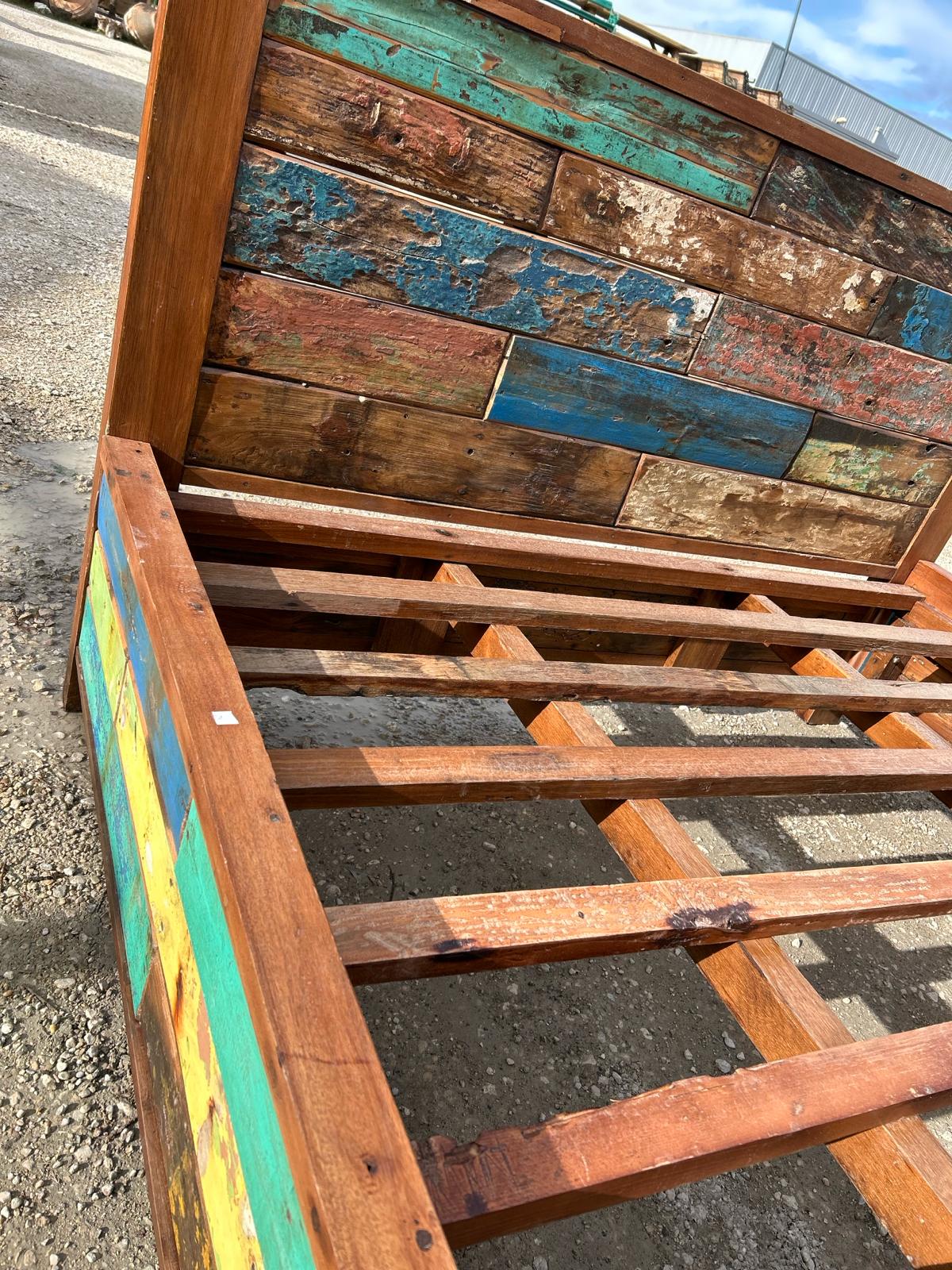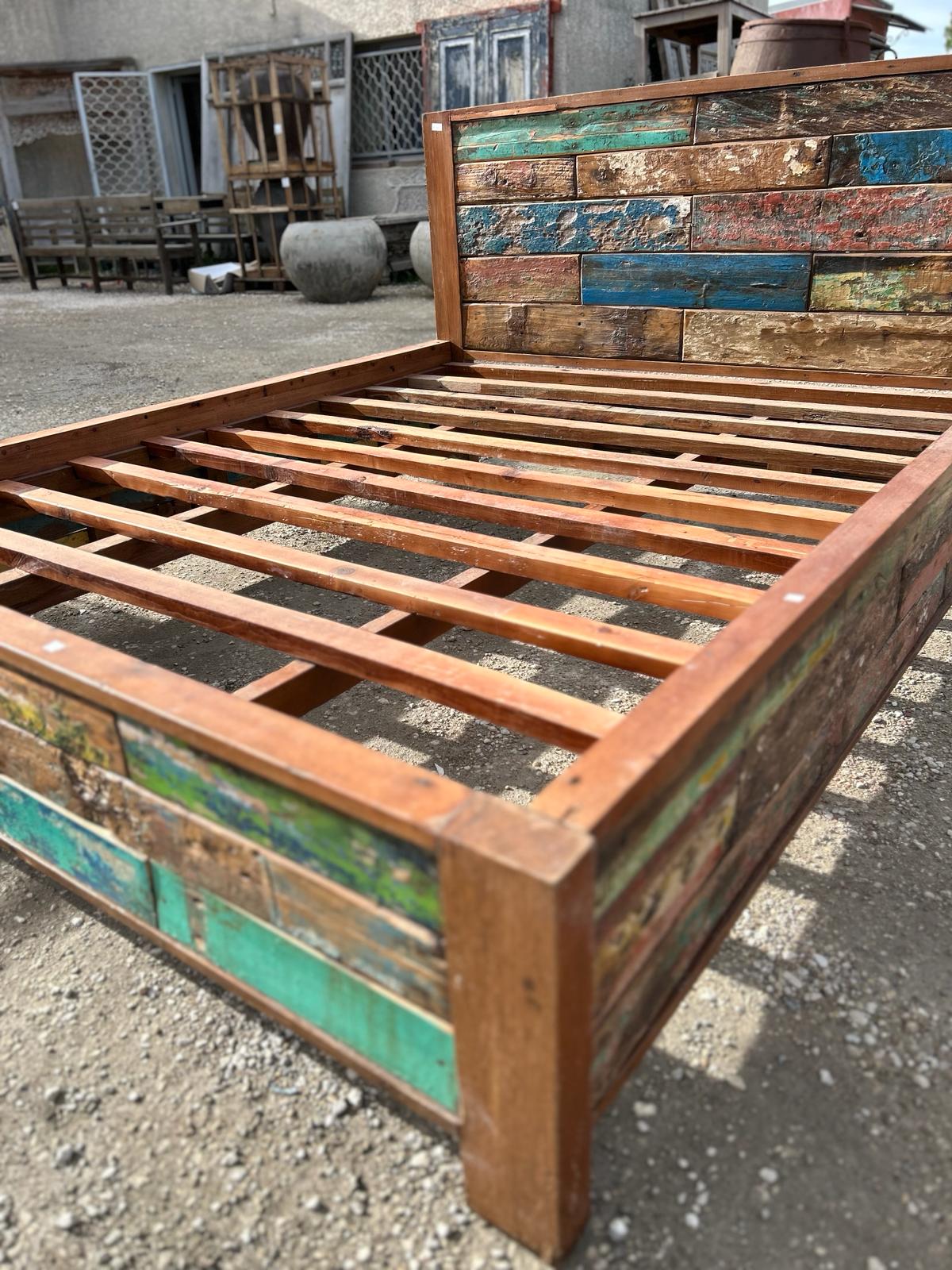 Lit en bois de bateau multicolore. Lit qui comprend une tête de lit et un encadrement pour un matelas de 160x200cm.