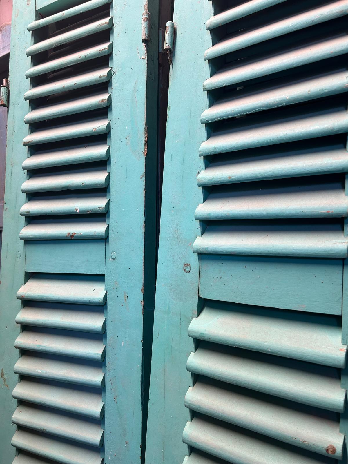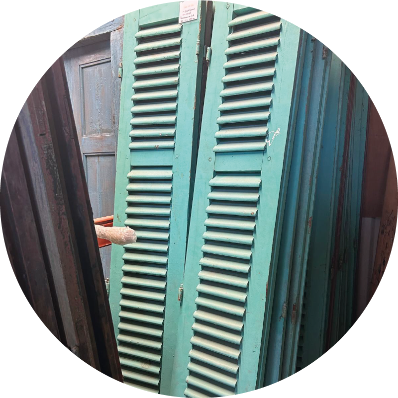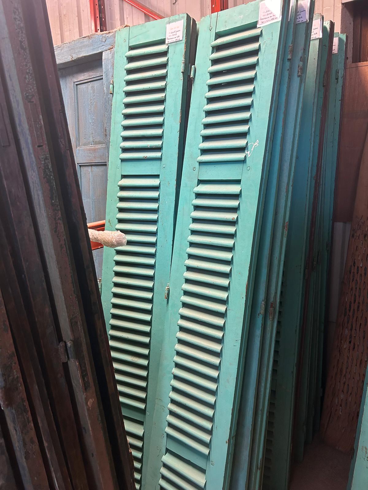 Paire de persiennes en teck, anciennes, IndonésieDimensions:Longueur: 32cmLargeur: 6cm Hauteur: 192cmEn stock: 7 paires