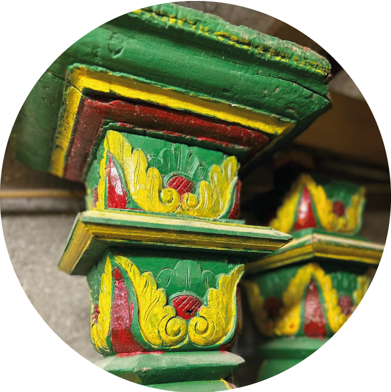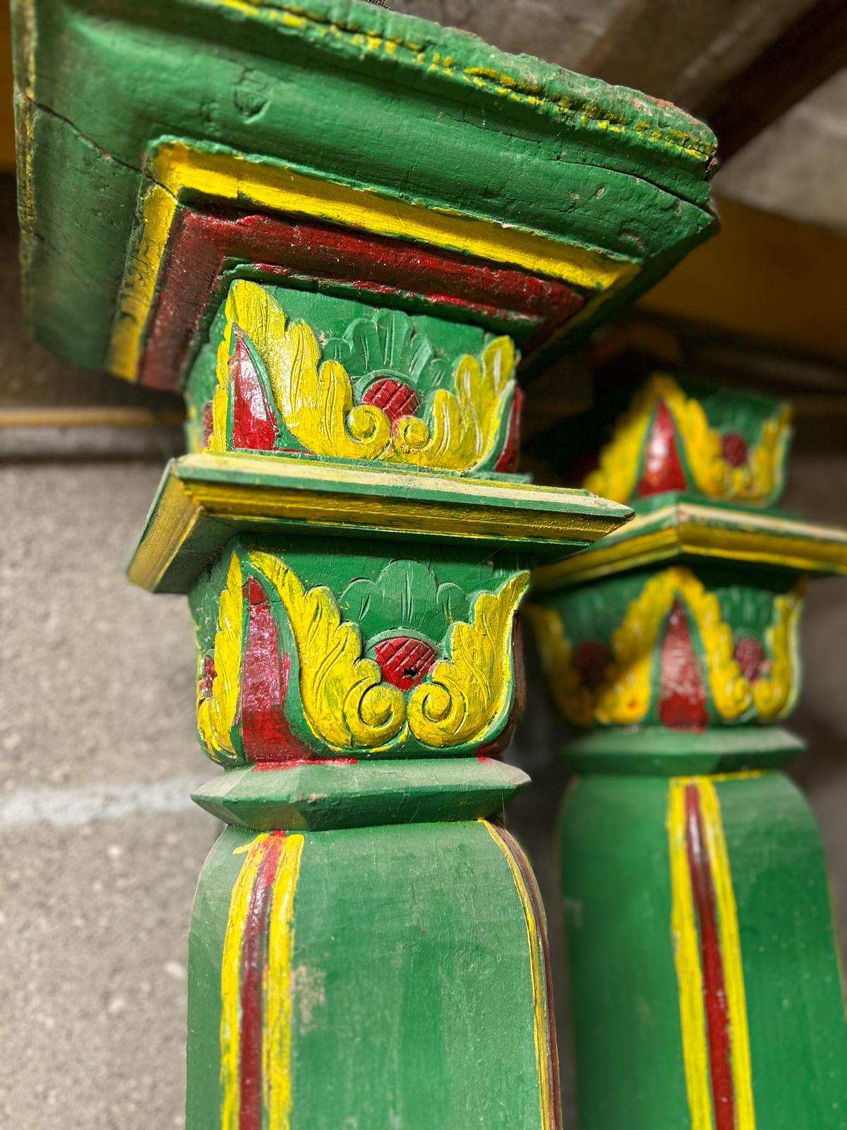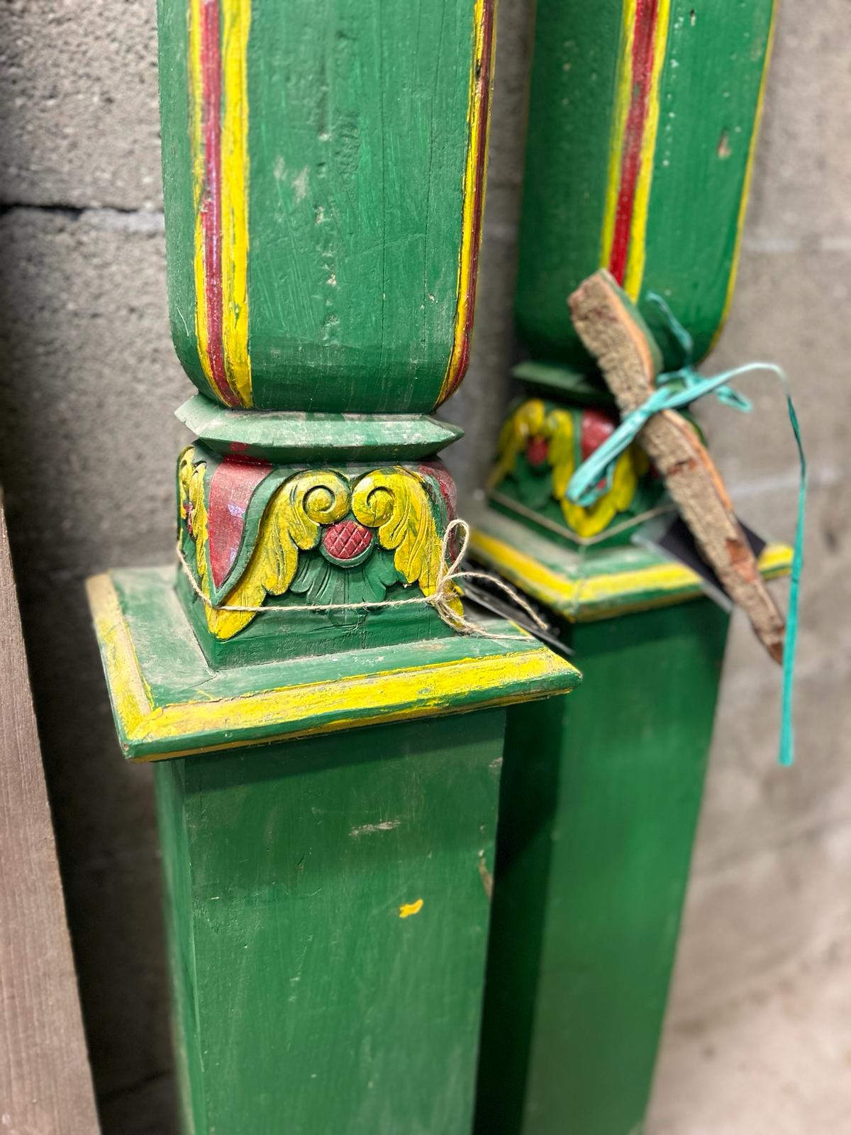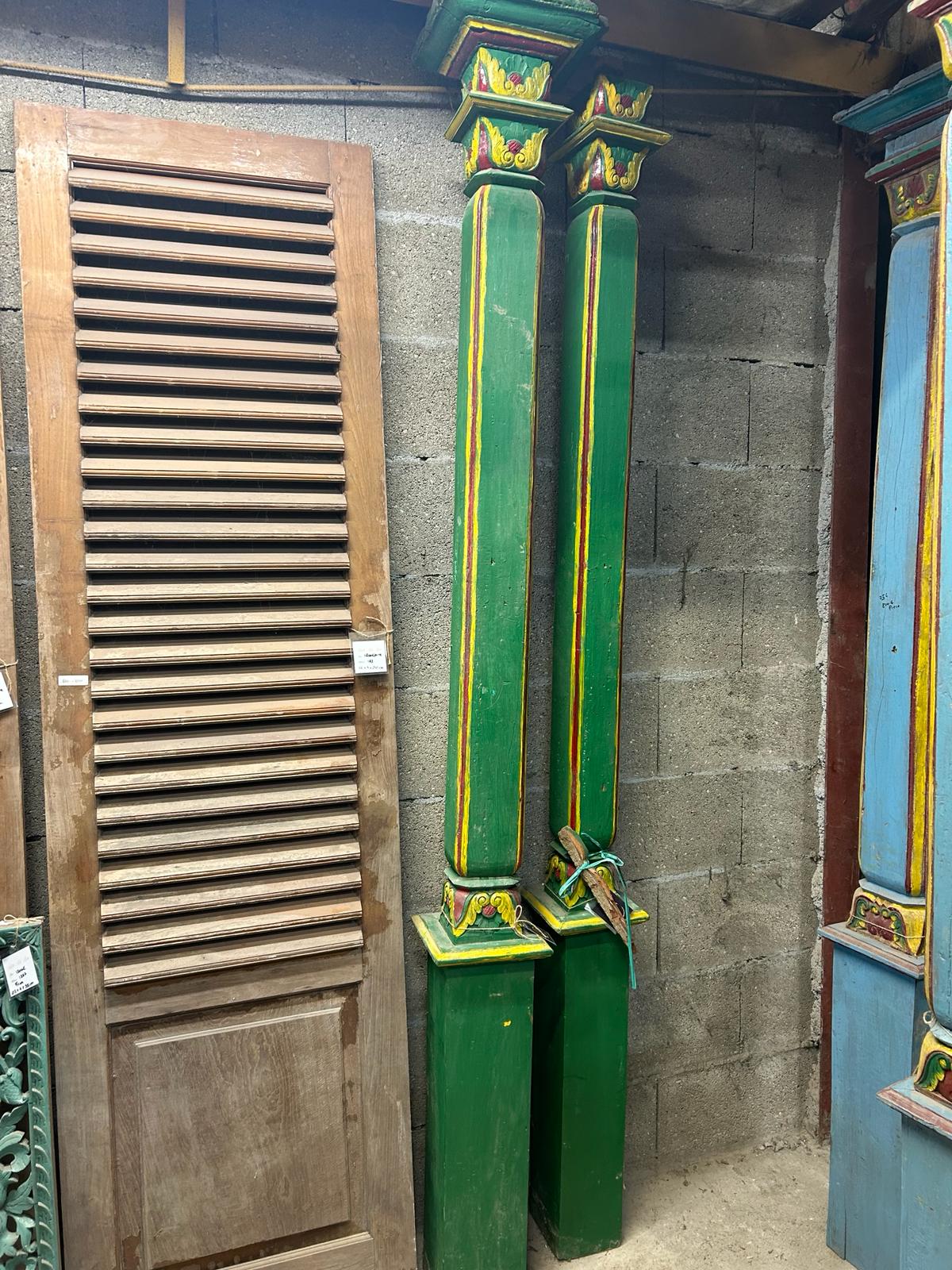 Piliers verts javanais en teck (avec détails verts, jaunes et rouges)