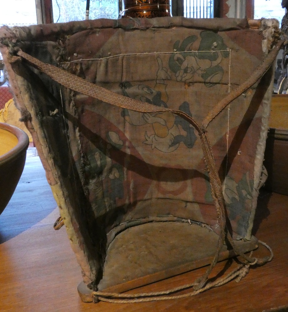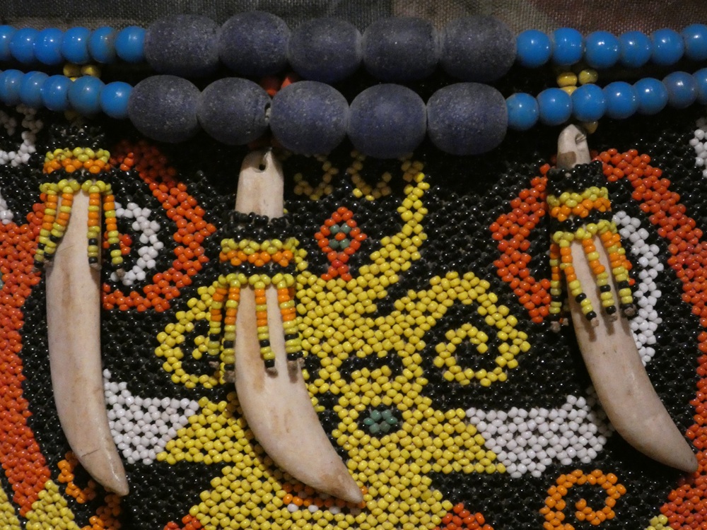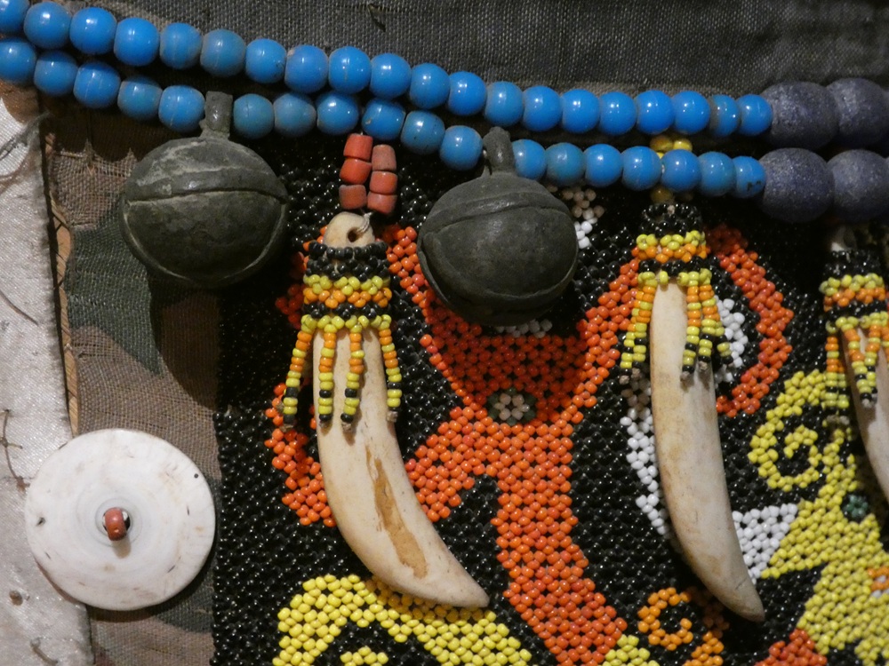 Porte bébé, ancien, tressage bambou recouvert de perles et décoré de dents de sanglier et grelots en bronze, Bornéo.