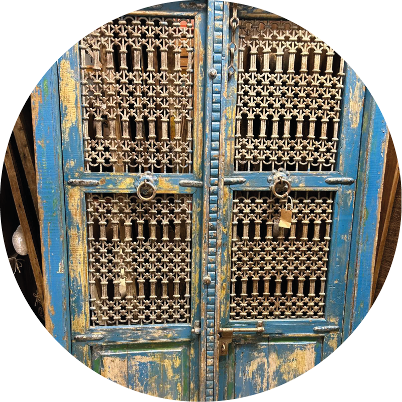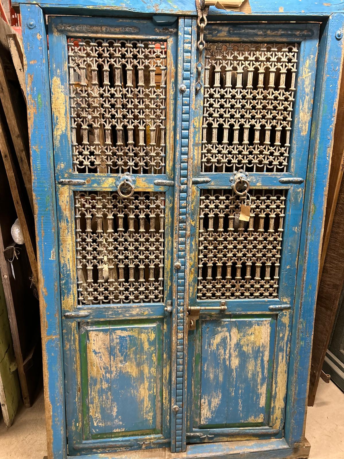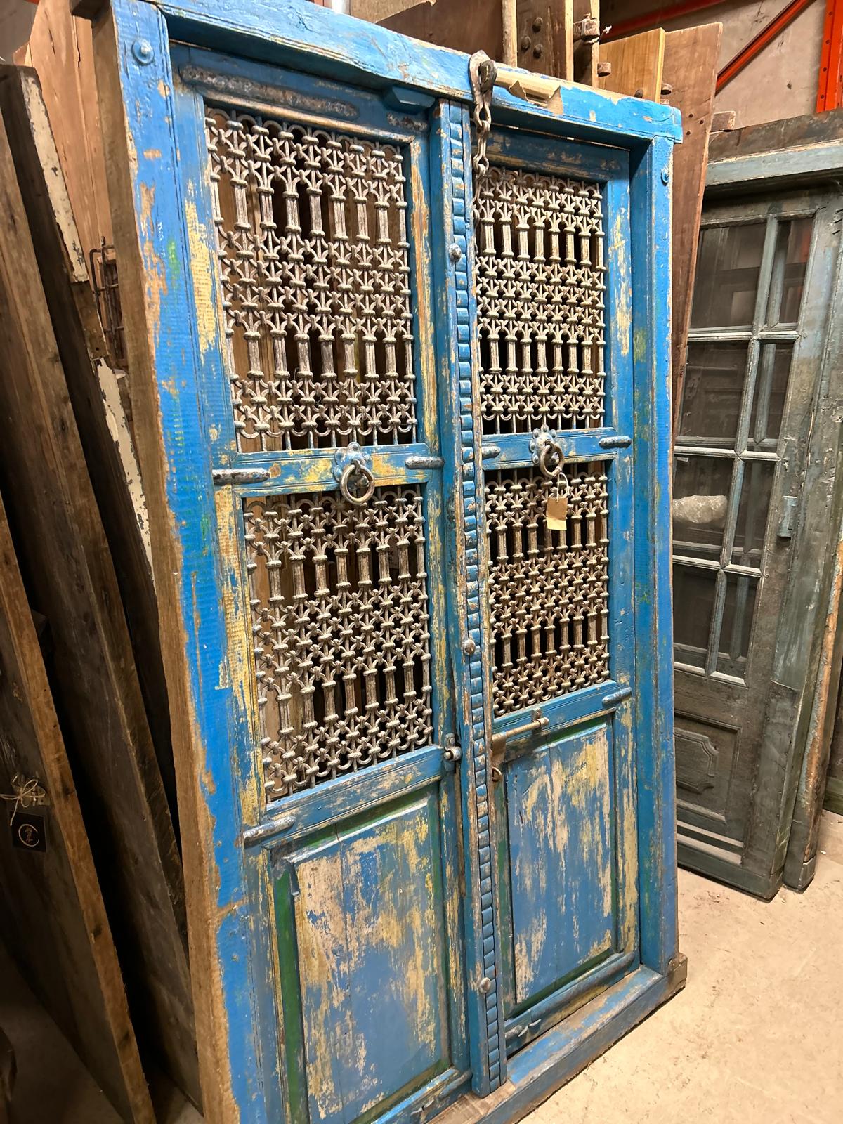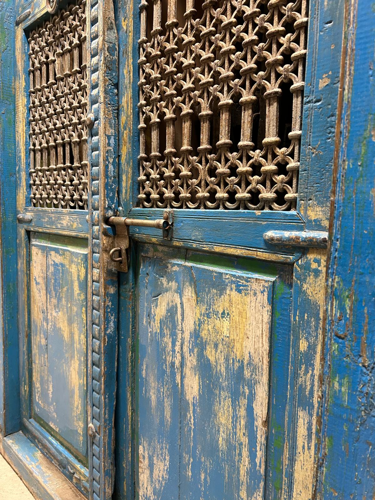 Porte double moucharabieh en teck du Rajasthan. La porte possède une patine bleue