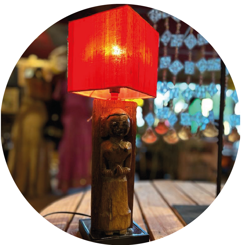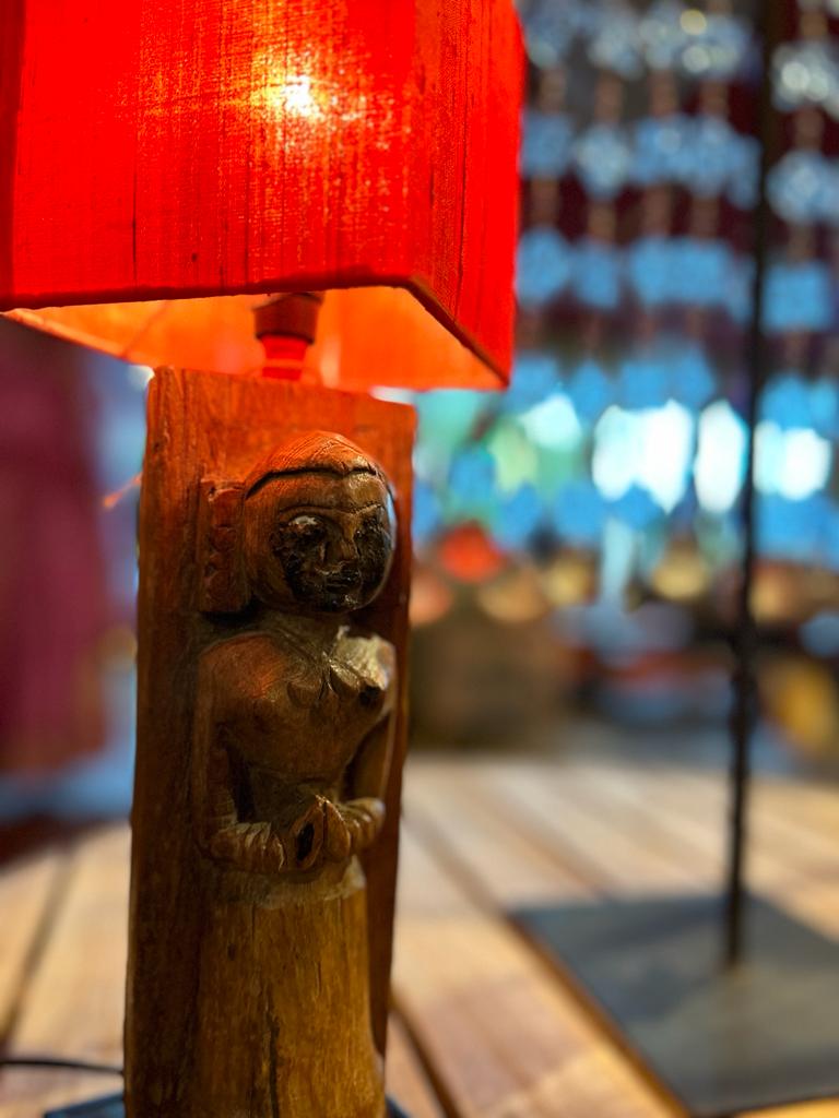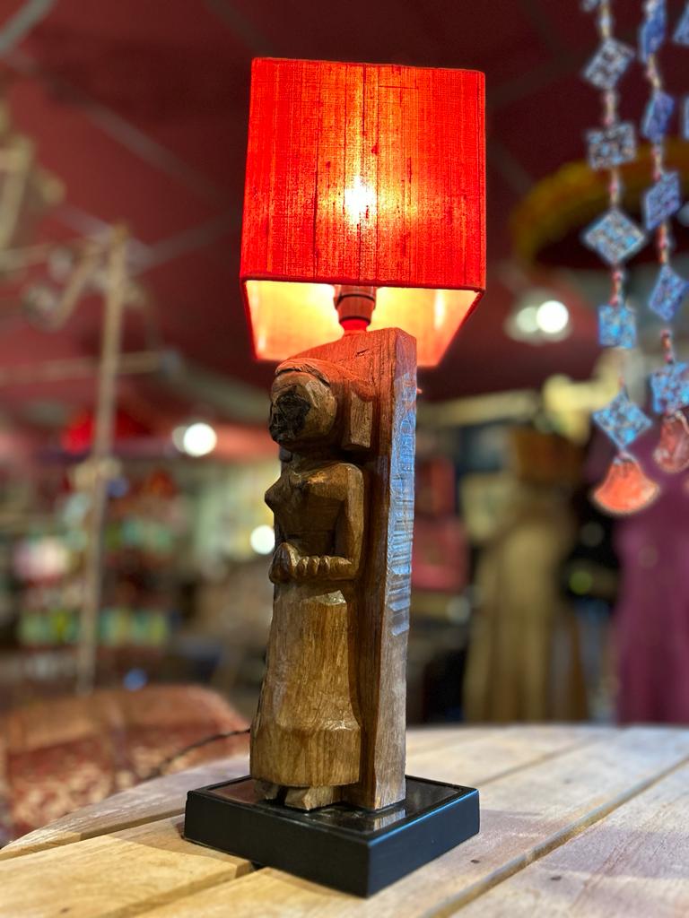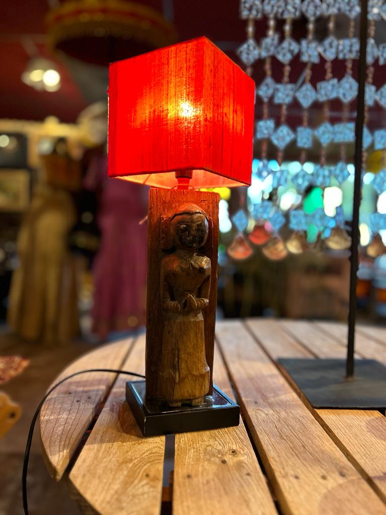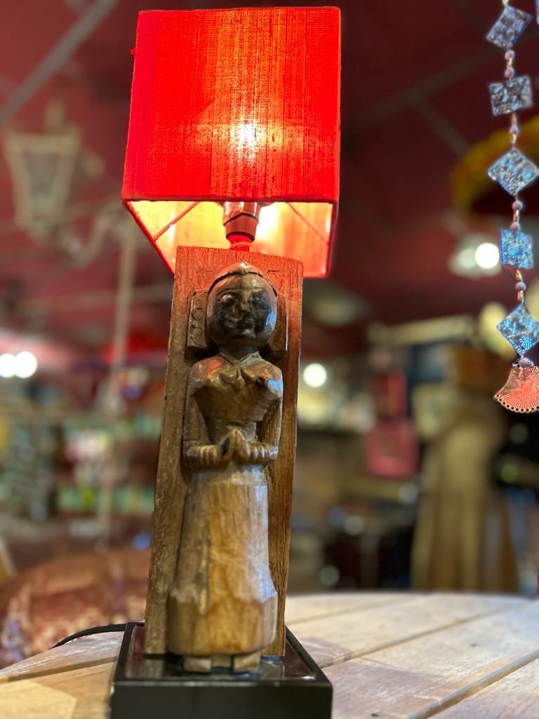 Statue du Rajasthan montée en lampe avec abat-jour rouge.Dimensions: Longueur: 13cm Largeur: 13cm Hauteur: 42cm