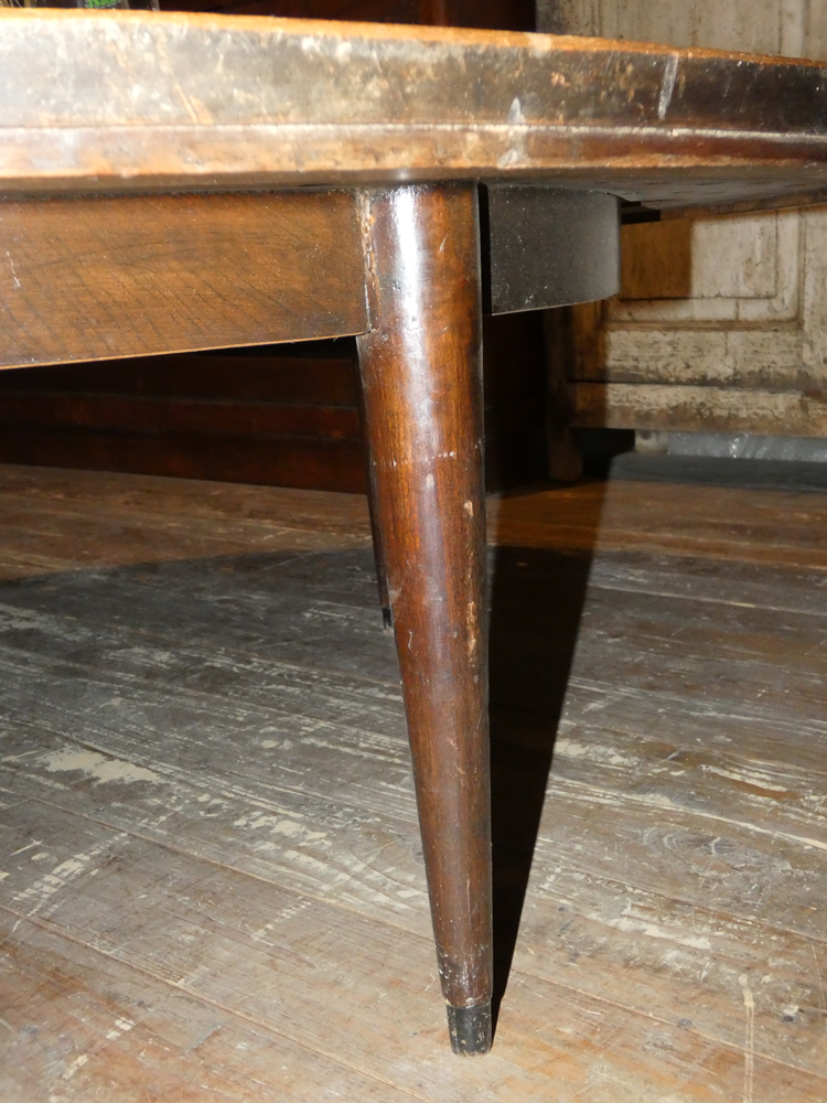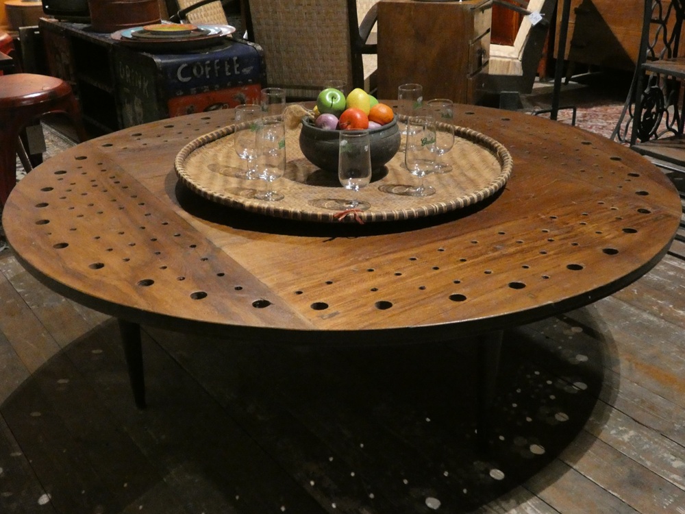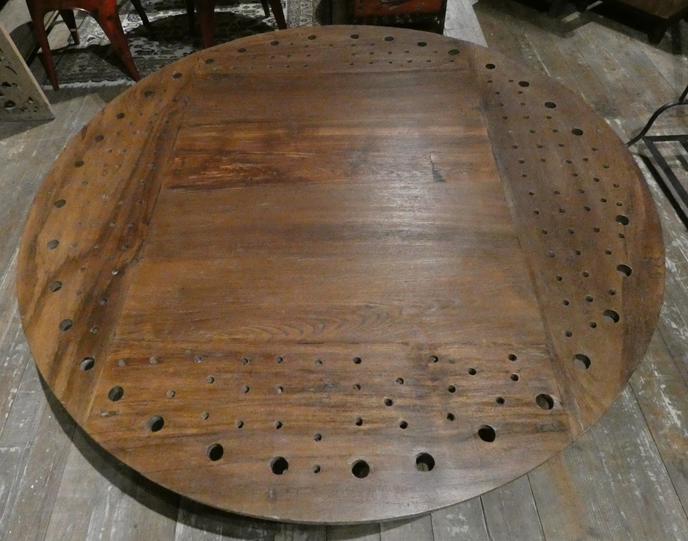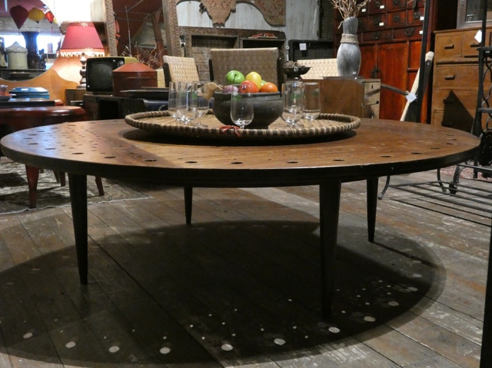 Table basse ronde en teck des années 50, ancienne, Indonésie.Dimensions:Diamètre: 150cm Hauteur: 45cmEn stock: pièce unique