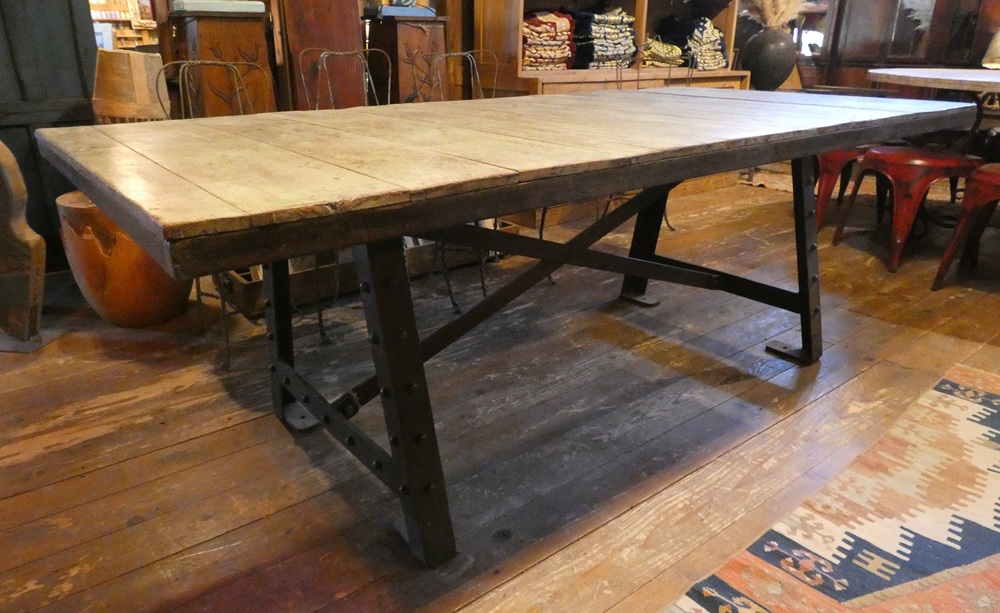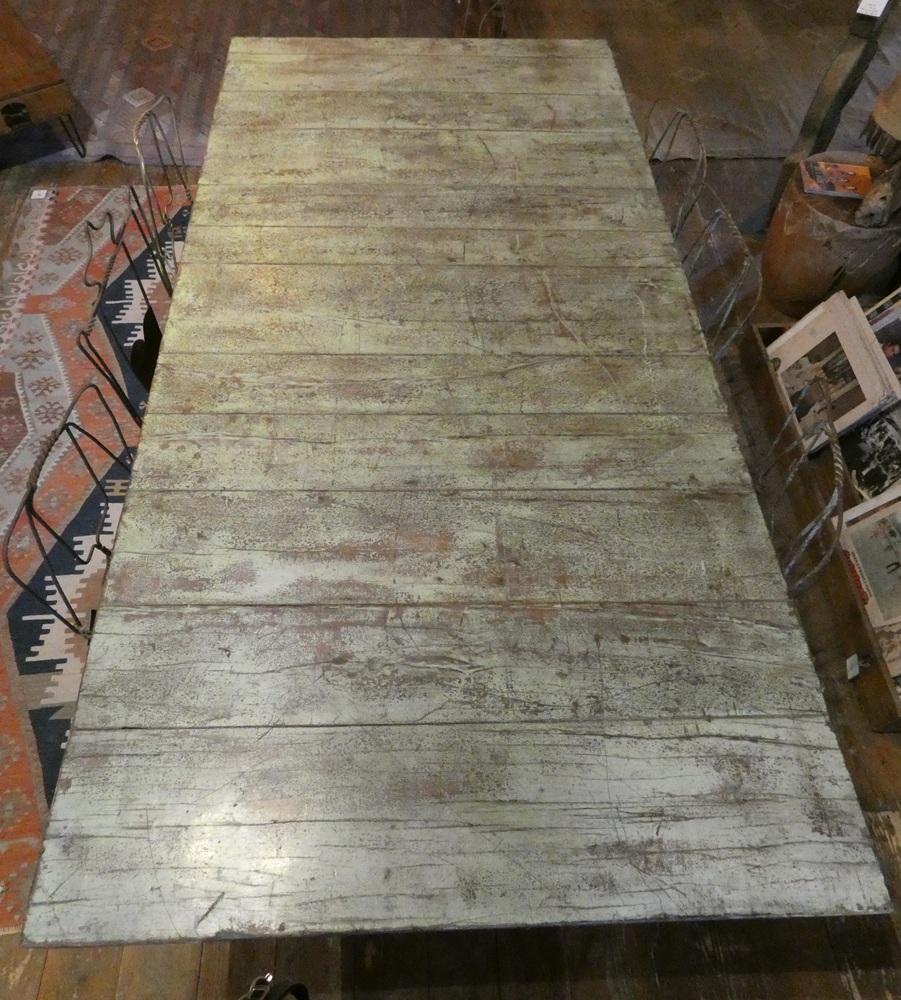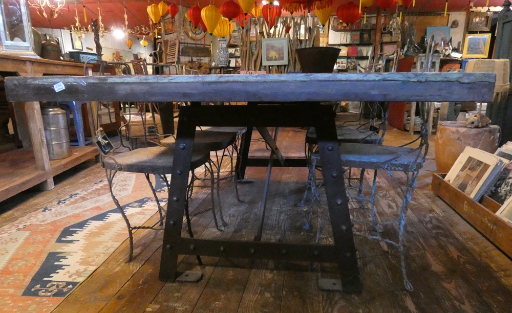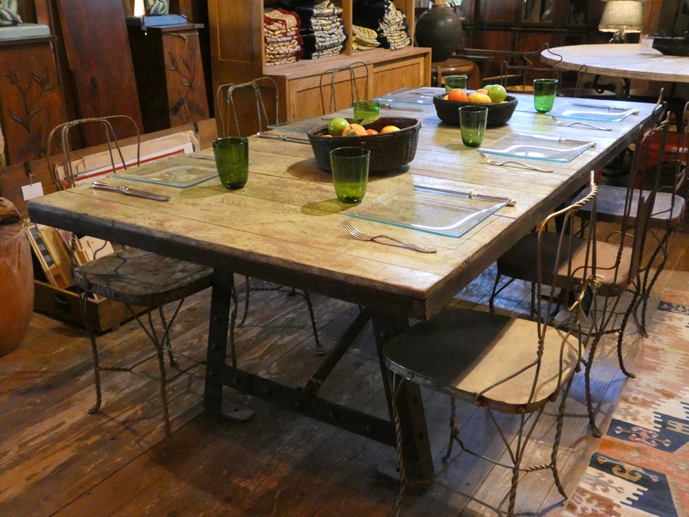 Table à manger, piétement en fer et plateau en teck recyclé, Inde.