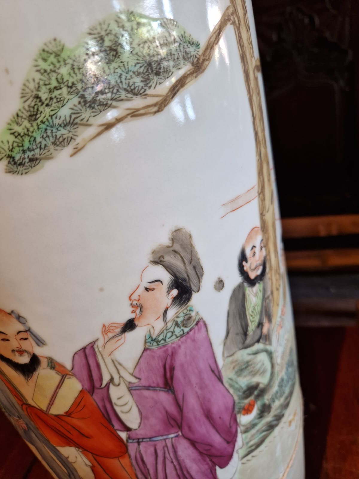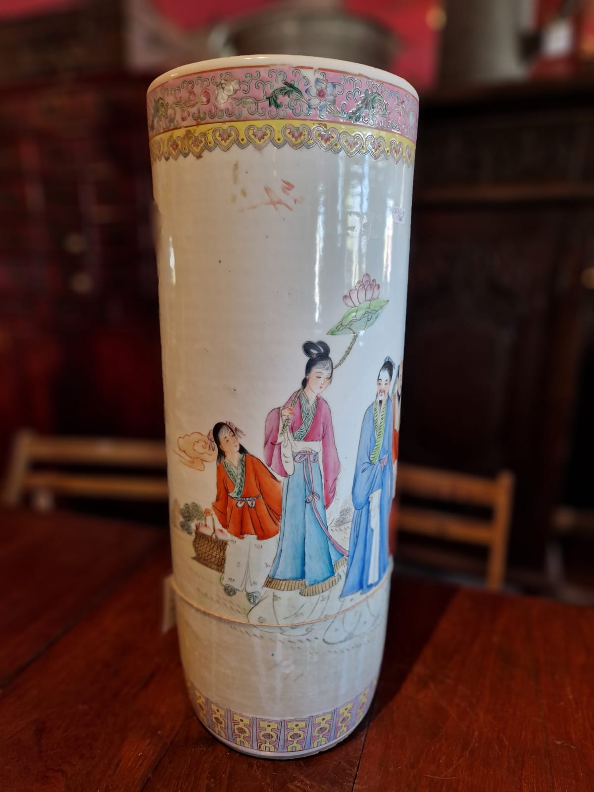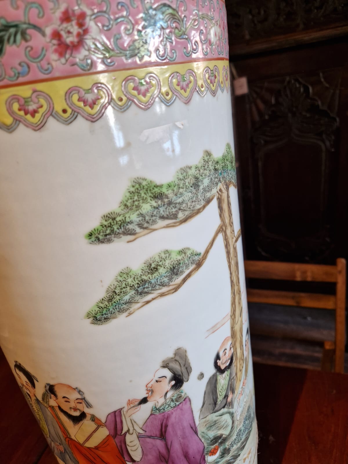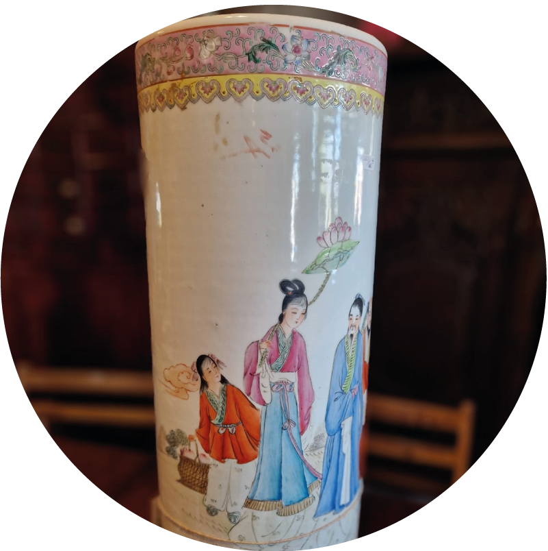 Vase chinois en céramique avec dessins chinois colorés (rose, blanc, bleu, jaune, rouge…) Ses couleurs prédominantes restent le jaune, le rose et le blanc.